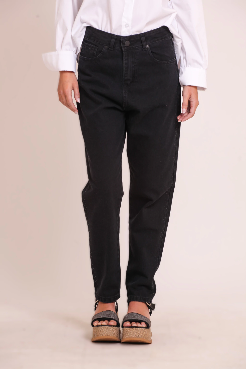 Descubrí el Jean Tiro Alto Mom Fit Black Tachas JE1628, una prenda que combina estilo, comodidad y un toque sofisticado para tu look diario. Confeccionado en gabardina negra de alta calidad, este jean presenta una línea de strass en cada pierna que aporta un brillo sutil y elegante, ideal para quienes buscan un diseño versátil.