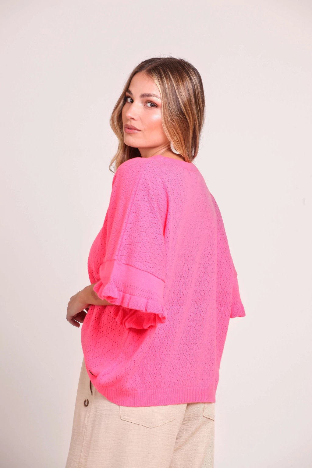 Descubrí la Remera Calada con Volados, una prenda diseñada para brindarte máxima comodidad y versatilidad. Esta remera ancha tejida es ideal para quienes buscan un estilo relajado sin perder elegancia.